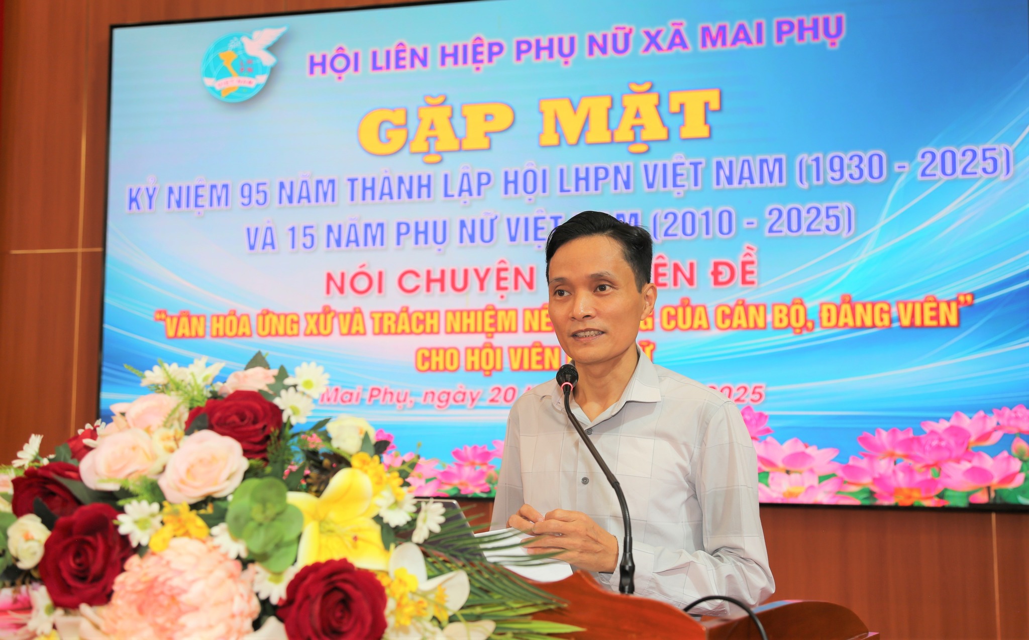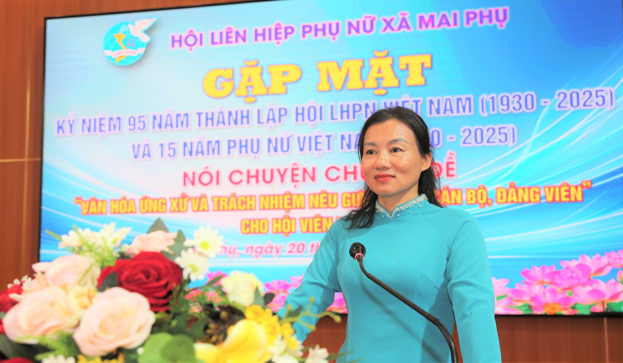Chiều 20/10/2025 Hội LHPN xã Mai Phụ tổ chức lễ gặp mặt kỷ niệm 95 năm thành lập Hội LHPN Việt Nam và 15 năm ngày Phụ nữ Việt Nam (2010 - 2025); Báo cáo nhanh kết quả Đại hội đại biểu Đảng bộ tỉnh Hà Tĩnh lần thứ XX và nói chuyện chuyên đề "Văn hoá ứng xử và trách nhiệm nêu gương của cán bộ, hội viên" cho hội viên phụ nữ trên địa bàn.