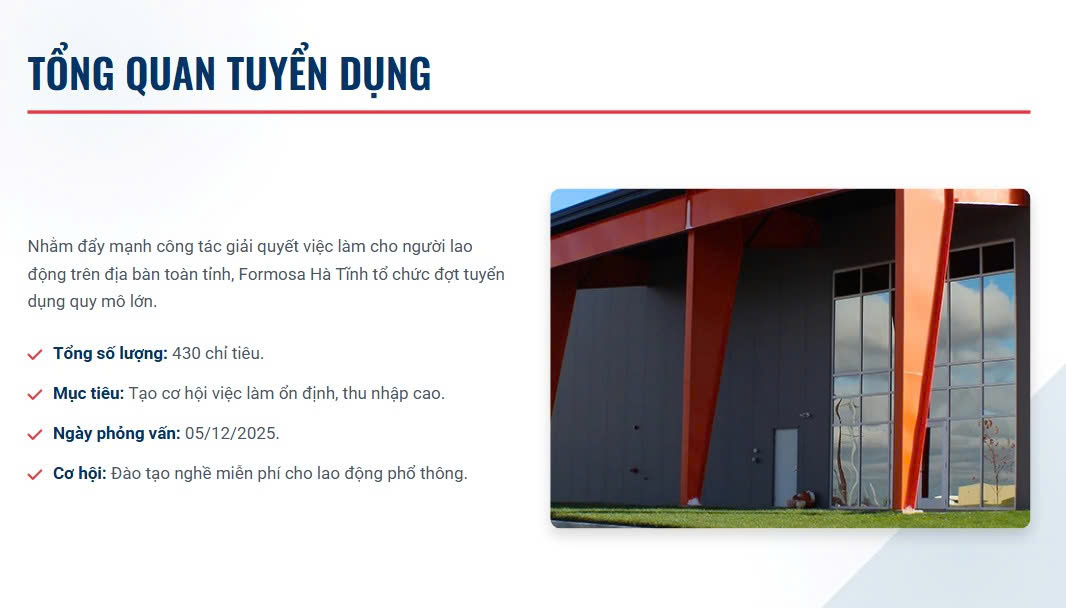 Nhằm đẩy mạnh công tác giải quyết việc làm cho người lao động trên địa bàn toàn tỉnh, Trung tâm Dịch vụ việc làm Hà Tĩnh phối hợp với công ty TNHH Gang thép Hưng Nghiệp Formosa Hà Tĩnh tổ chức tuyển dụng lao động, cụ thể như sau