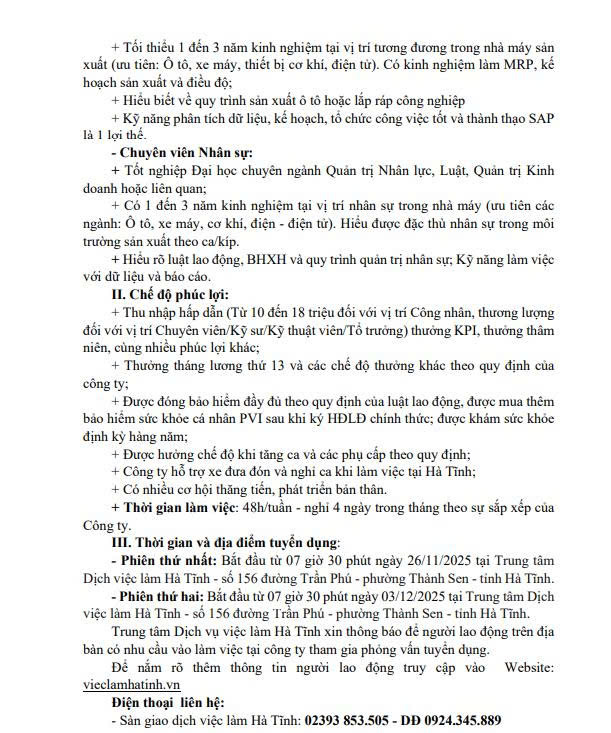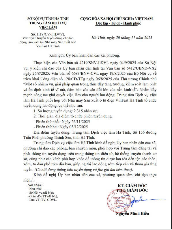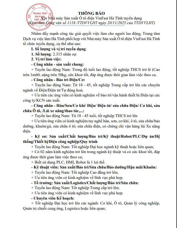 Nhằm đẩy mạnh công tác giải quyết việc làm cho người lao động, Trung tâm Dịch vụ việc làm Hà Tĩnh phối hợp với Nhà máy Sản xuất ô tô điện VinFast Hà Tĩnh tổ chức tuyển dụng 2.315 lao động (cụ thể theo văn bản đính kèm)