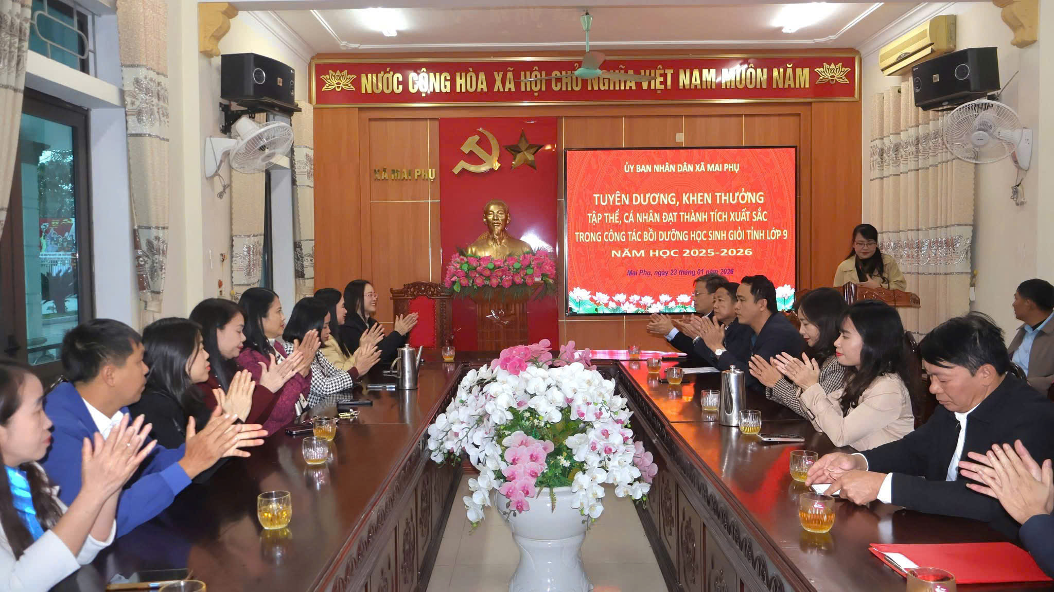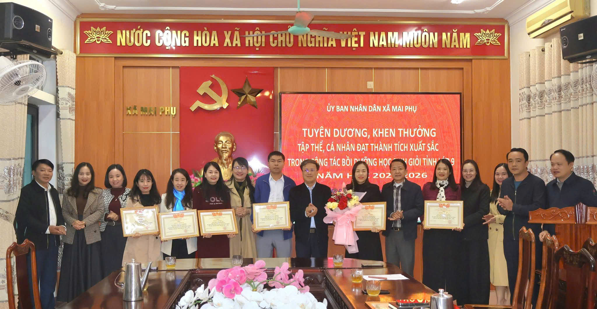 Thiết thực chào mừng Đại hội lần thứ XIV của Đảng và bầu cử Đại biểu Quốc hội, HĐND các cấp nhiệm kỳ 2026 - 2031, chiều ngày 23/01/2026, Ủy ban nhân dân xã Mai Phụ tổ chức Lễ trao tặng Giấy khen của Chủ tịch UBND xã cho tập thể và các cá nhân Trường THCS Mỹ Châu có thành tích xuất sắc trong công tác bồi dưỡng học sinh giỏi tỉnh năm học 2025 - 2026. Tham dự buổi lễ có các đ/c Thường trực Đảng ủy, lãnh đạo HĐND, UBND, Ủy ban MTTQ xã, cùng Ban Giám hiệu và các cá nhân được khen thưởng của Trường THCS Mỹ Châu.